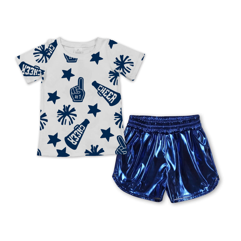 Custom style MOQ:3pcs girl Shiny Navy Blue Shorts with Cheer Shirt(Production of tops and shorts is RTS)
